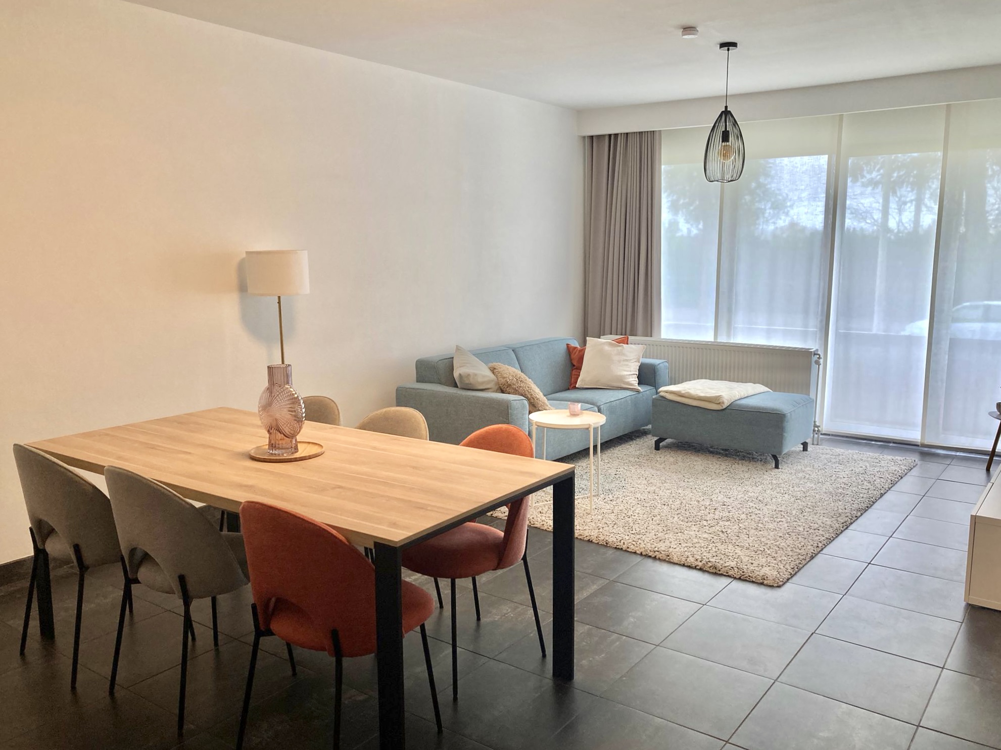 Via de inkomhal voorzien van een apart gastentoilet, betreed je dit royaal appartement met een bewoonbare oppervlakte van ca. 90 m². Het hele appartement is voorzien van grote raampartijen, wat zorgt voor een lichtrijk geheel. De leefruimte is ingedeeld in salon- en eetgedeelte en staat in directe verbinding met de nieuwe keuken. Zowel de leefruimte als keuken, bieden directe toegang tot het terras via een schuifraam. Door zijn ideale zuidoriëntatie kan je hier de hele dag door zalig genieten van de zon.